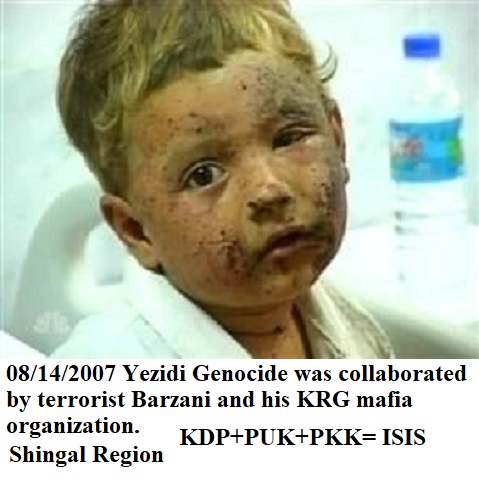The 13thCommemoration of Yezidi Genocide in Al-Qahtaniya and Al-Jazeera collective villages in Mount Shingal - Aug.14, 2007 - Aug.14, 2020 The Day of Treachery and Betrayal by the KRG mafia of Barzani “The US, UK, France and the UN know that the KRG’s plan to destroy the minorities in Iraq and specifically to annihilate Yezidis! “Why the UN and all those international communities are still ‘Supporting the Barzani and his KRG’s terrorist organization against the innocent non-Muslim minorities?’”